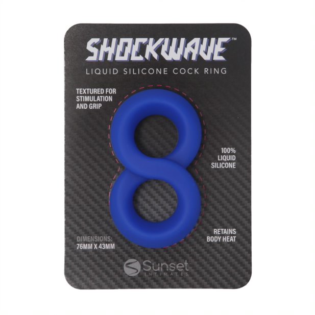 This ultra stretchy figure-8 style cock ring is sure to please both you and your partner! The shape and texture provides the ultimate in erection strength and stamina. The special design of this cock ring provides ultimate comfort and ultimate performance. This ring has one ring for the base of the shaft and one ring for around the balls, giving you the ability to last even longer! Get your gun ready for a long night with the Shockwave Double Cock Ring.