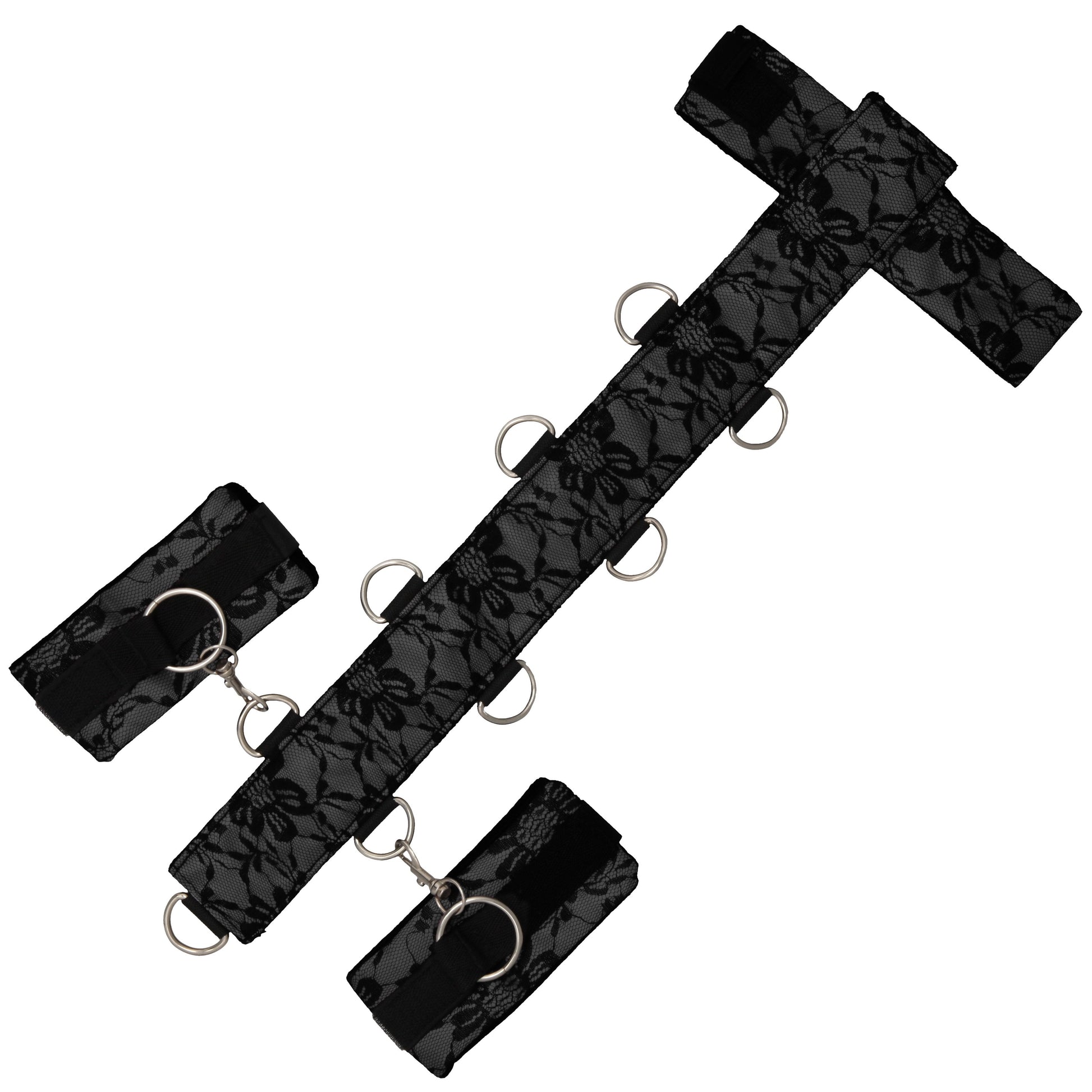 Submit in style with this sensual lace neck and wrist body restraint. This body restraint can be worn in the front or back of the body for versatile submission. Adjust the wrists as high or as low as you see fit. An adjustable collar and soft plush lining provide a comfortable restraint in any position. Multiple O-Rings provide room for other restraint setups and other binding options. Get creative with this luxurious body restraint!