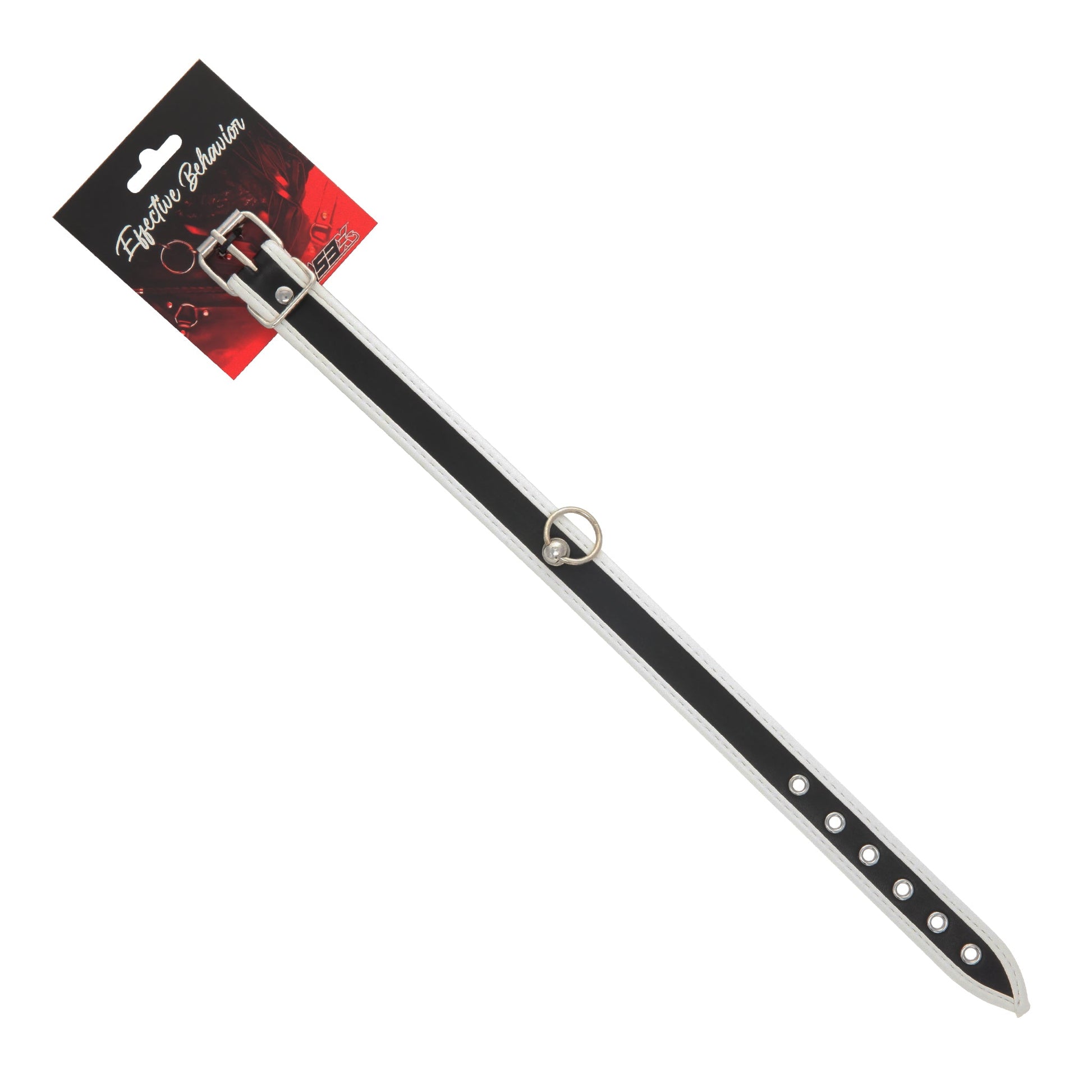 Flirty and sleek, this bondage collar is made of premium PVC, with a bold white border. The collar features a single loop ring in the front and a sturdy buckle clasp in the back. Perfect for dressing up - or wearing nothing else - spark excitement while wearing this effective behavior accessory!