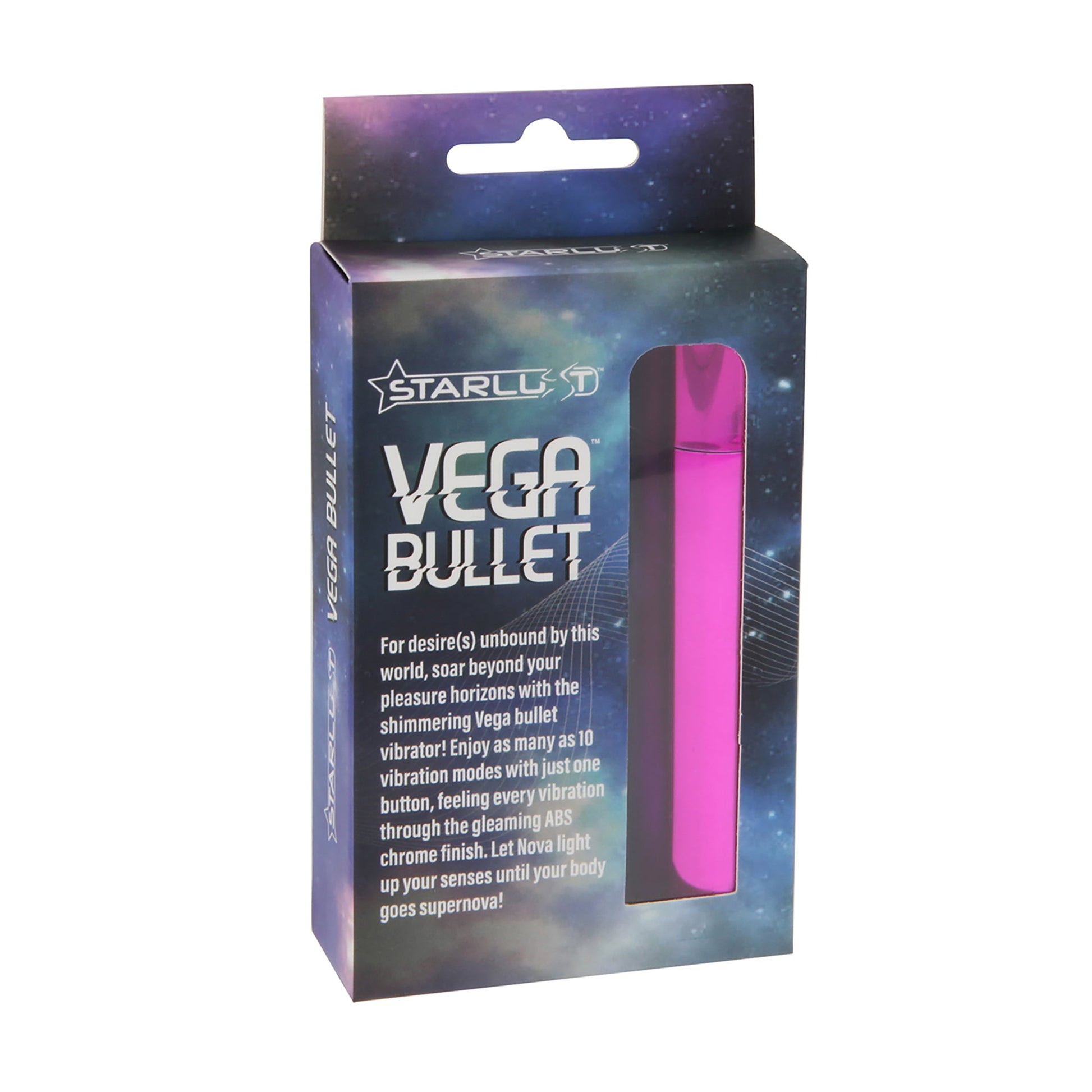 For desire unbound by this world, soar beyond your pleasure horizons with the shimmering Vega bullet vibe! Enjoy as many as 10 vibration modes with just one button, feeling every vibration through the gleaming ABS chrome finish. Let Vega light up your senses until your body goes supernova!